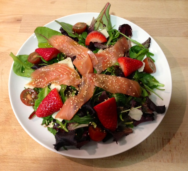 Agafeu l’amanida la repartiu pel plat, tallem els tomàquets per la meitat els repartim i hi posem una mica de sal (el salmó ja porta prou sal i el formatge també), tot seguit, posem les làmines de formatge parmesà i els talls de salmó tallats a tires. I ara hi posem l’oli i el vinagre.Hi afegim les maduixes (les podeu posar senceres o tallades) i finalment hi posem unes llavors de sèsam per decorar.