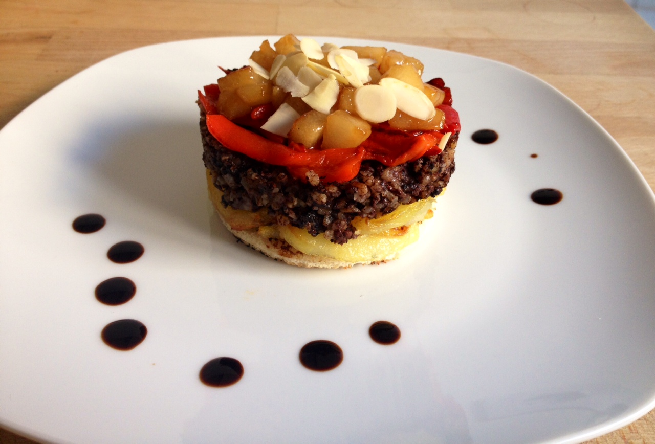Ara ja tenim tots els components del timbal preparats, així que anem a emplatar!, Agafem l’ Aro inoxidable i posem a la base el pa torrat, a sobre les patates amb la ceba, a sobre la morcilla esmicolada, després les tires de pebrot escalivat, i finalment la pera caramel·litzada i les làmines d’ametlla.
