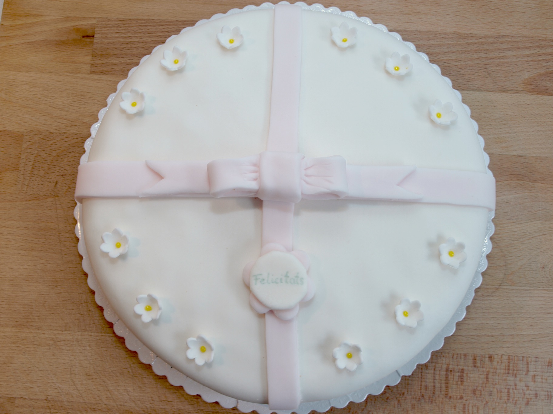 Si voleu fer una base blanca de fondant com al pastís de la foto, primer haureu de tallar ben recte la part superior del pa de pessic (es a dir, treure la crosta), després tallar-lo pel mig i posar-hi el farcit de xocolata blanca vigilant que no es desbordi pels costats. Després haureu d’estirar el fondant amb un corró de fusta o plàstic pensant que haureu de fer una circumferència força més gran que el diàmetre del pastís, per col·locar-lo sobre el pa de pessic utilitzeu el corró, enrotlleu el fondant i el desenrotlleu sobre el pa de pessic començant per un extrem i amb molta cura anem ajustant les cantonades, tallarem la pasta que sobri amb un ganivet ben esmolat. Un cop tingueu la base blanca (o del color que vulgueu) podeu afegir-hi la decoració que més us agradi, penseu que normalment a les botigues on venen fondant també venen cola comestible per enganxar les decoracions.
