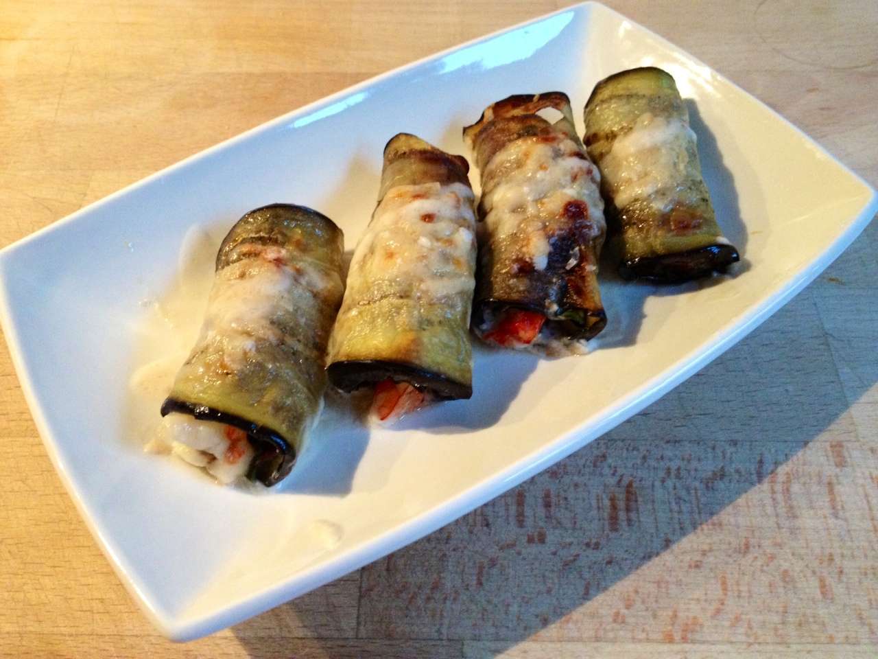 Després comencem a muntar els rotllets: agafeu un tall d’albergínia, a sobre hi poseu un tall de pernil, després a sobre del pernil 2 o 3 cues de gambes (depenent de la mida) i finalment un parell de fulles d’alfàbrega fresca. Tanqueu el rotllet i el poseu a la safata del forn. Poseu una mica d’oli a la safata per evitar que s’enganxin els rotllets.