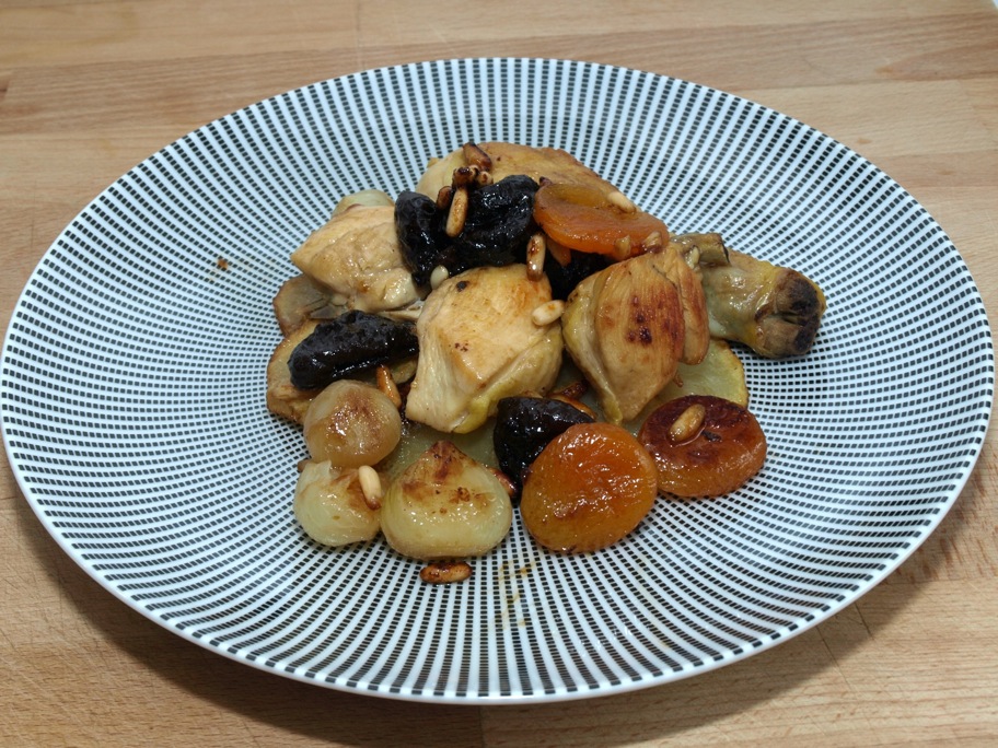 Salem pebrem el pollastre i l’enrossim amb l’oli ben calent, un cop enrossit, abaixem el foc i hi afegim les cebes (pelades) i els grans d’all (sense pelar), ho courem a foc lent, un cop la ceba és rossa i tendre hi afegim el Brandy i els fruits secs, i un parell de minuts després les patates. Ho tenim al foc lent fins que es redueixi el Brandy.